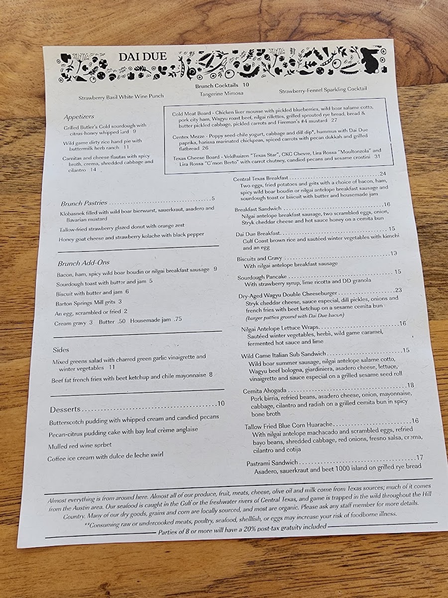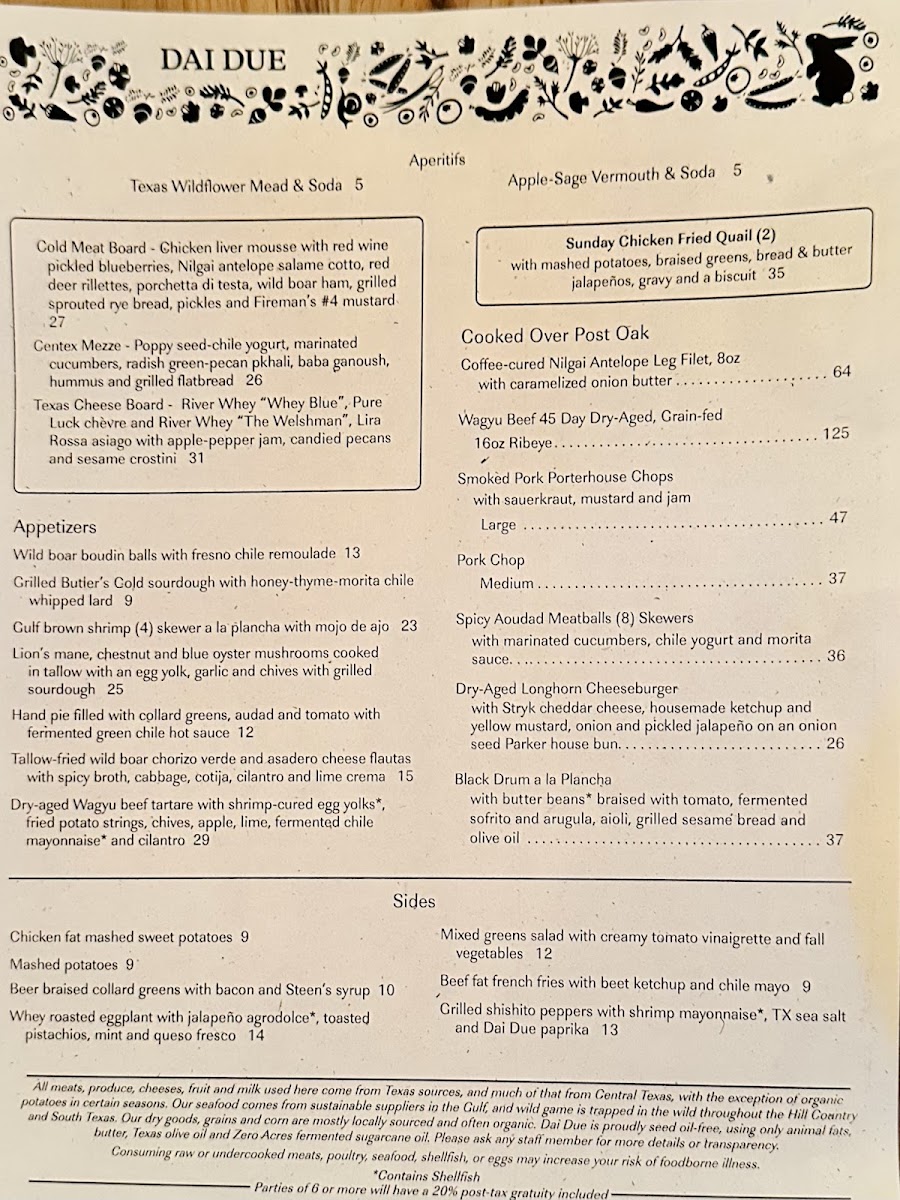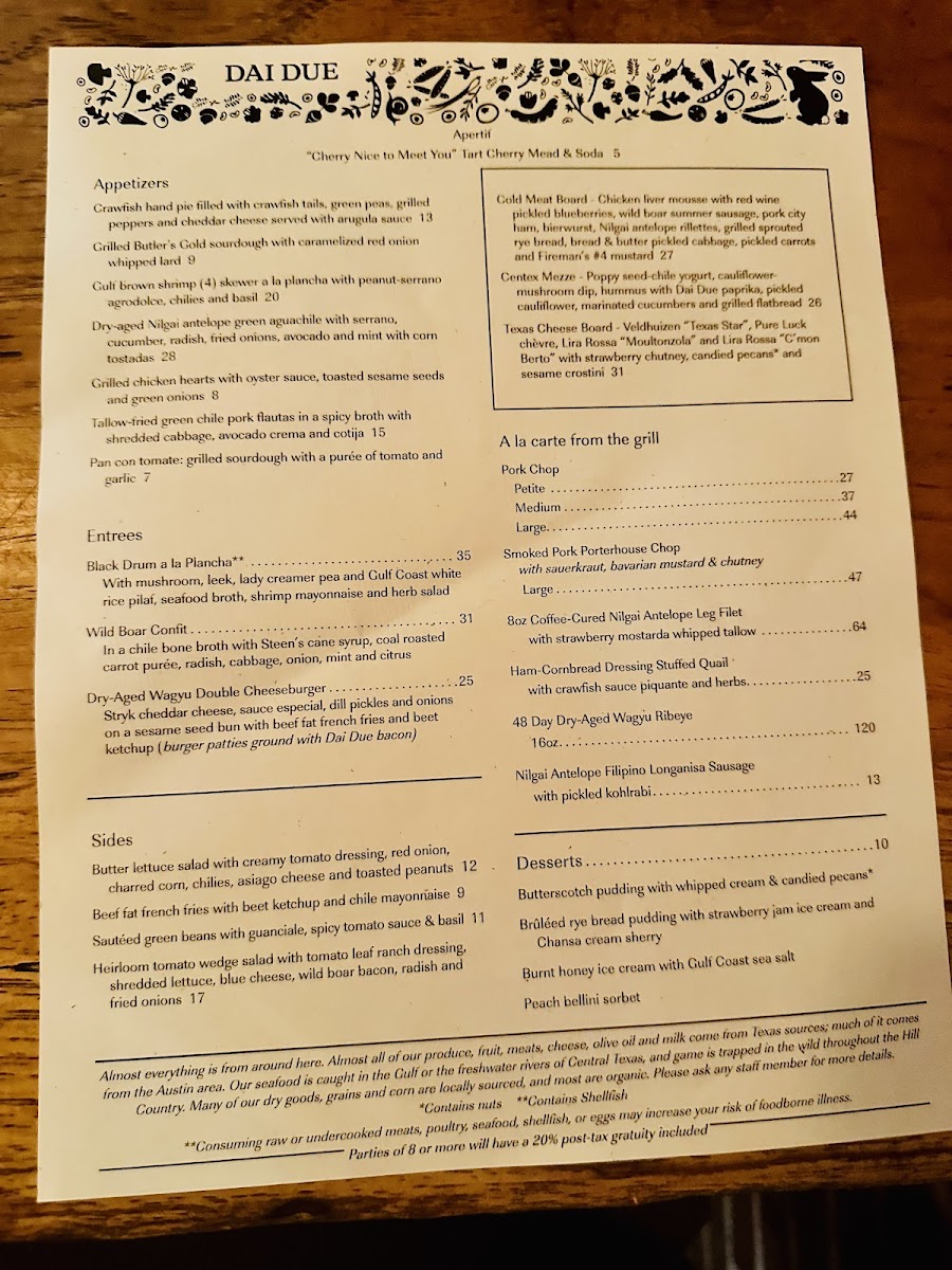 Welcome to Dai Due, a gem nestled in Austin, Texas, renowned for its farm-to-table ethos and vibrant culinary offerings. Here, each dish sings with freshness, skillfully highlighting local ingredients. The menu boasts distinctive entrees like Wild Boar Confit immersed in a chile bone broth and finished with sweet potato puree and herbs, and the indulgent Dry-Aged Wagyu Double Cheeseburger served with beef fat fries.